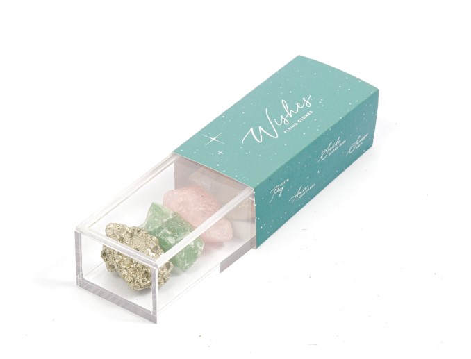 Comandada PELA designer Verinha Cid, a Flying Stones tem diversas opções de presentes. Representando uma forma diferente de celebrar o espírito natalino, a caixa Wishes (R$ 295) é composta pelas pedras quartzo rosa, quartzo verde, cristal e pirita que simbolizam amor, saúde, paz e sucesso. Mais informações: www.flyingstones.com.br