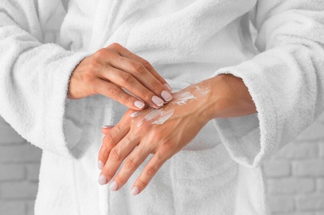 Sempre que lavar as mãos, aplique um produto para resgatar a vitalidade e minimizar os poros abertos. Pode ser um hidratante, que tenha na composição leite de amêndoas, figo, aveia, cálcio, cacau, ativos que ajudam a reparar a pele fragilizada. Não use aqueles com petrolatos na composição, como eles são derivados do petróleo, podem fazer mal para a pele.