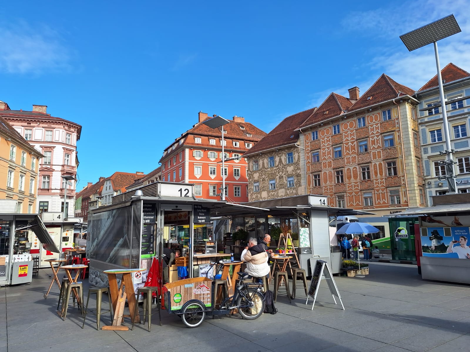 HAUPTPLATZ – Passeando pela Old Town Graz será inevitável conhecer a praça principal – Hauptplatz der Stadt – o coração da cidade. Ali vemos uma grande concentração de prédios de arquitetura clássica, o belo edifício da prefeitura, cafés charmosos, muitas lojas e diversas barraquinhas que vendem comidas típicas e deixam a praça ainda mais animada. Ao redor da Hauptpltaz, lojas de marcas conhecidas e uma boa variedade de restaurantes a escolher. O vai e vem dos Trams que passam por ali parecem fazer com que a cidade não só se conecte mas a faça vibrar. Eles são coloridos, cada um com uma pintura diferente, fazendo jus à ligação entre a cidade e o design.