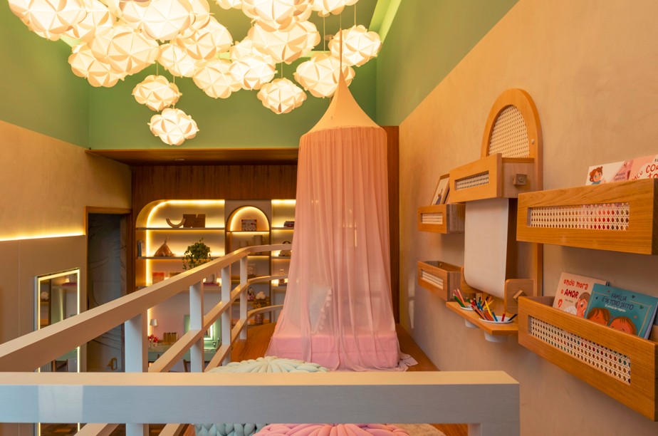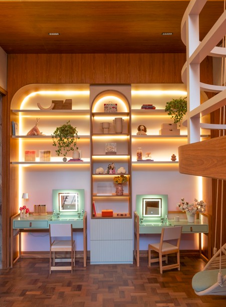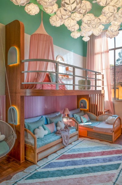 3 – Cantinhos com múltiplos usos: No mezanino, pufes em forma de flor, estantes de livros e tapete redondo criam um refúgio elevado para ler e sonhar. No nível inferior, a escrivaninha dois em um faz as vezes de espaço de estudo e penteadeira, enquanto o cantinho de leitura com dossel acolhe momentos de introspecção.