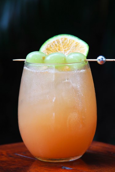 Colocar as uvas na coqueteleira e macerar. Depois colocar o suco de tangerina, bater e fazer uma coagem em um copo de drink sem álcool com gelo e completar com tônica de gengibre. Decoração: Um lance de grenadine e um espeto de uva, hortelã e limão desidratado.