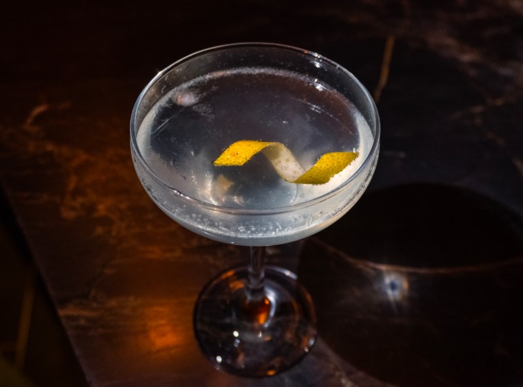 Em uma coqueteleira, adicione todos os ingredientes – exceto a água – e gelo. Bata vigorosamente por cerca de dez segundos. Faça uma coagem para uma taça dry pré-resfriada. Complete com a água. Decore com zest de limão.