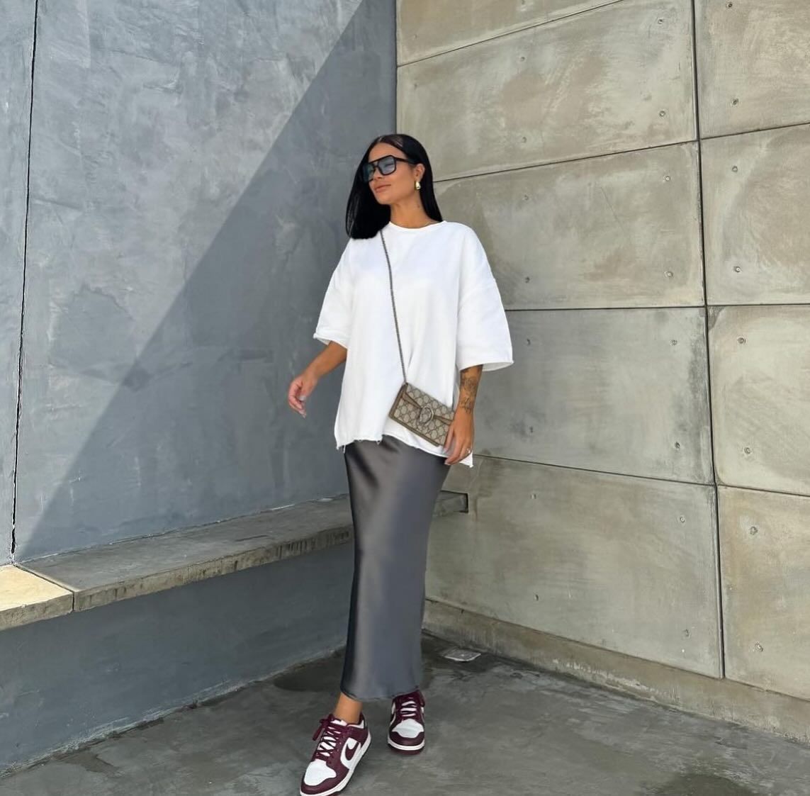 • Saia Midi: Para um toque feminino e sofisticado, use sua camiseta com uma saia midi. Pode ser lisa ou estampada, mas sempre com um corte que valorize sua silhueta.