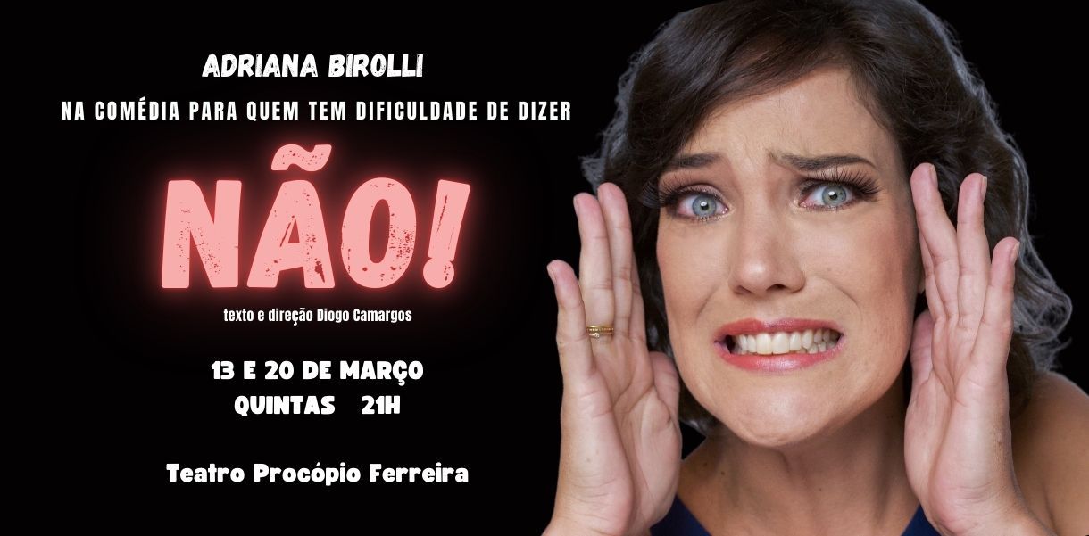 A atriz Adriana Birolli apresenta, nos dias 13 e 20 de março, às 21h, no Teatro Procópio Ferreira a comédia “Não!”. O monólogo é sobre uma personagem prestes a completar 36 anos e que não quer ir à comemoração do seu aniversário. A peça, que tem texto e direção de Diogo Camargos, reflete com muito humor sobre a jornada de uma mulher que vive em uma busca da liberdade de dizer não.