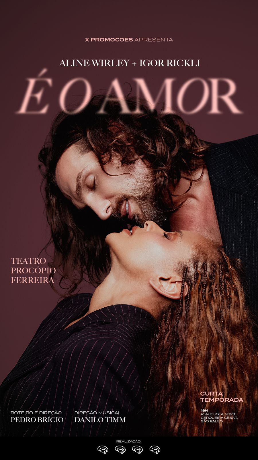 O casal de atores Aline Wirley e Igor Rickli estreiam a peça ‘É o Amor’ no Teatro Procópio Ferreira. O espetáculo, que ficará em cartaz em curta temporada de 11 a 27 de junho, é uma experiência musical teatral que promete uma jornada irreverente e inteligente através dos altos e baixos dos relacionamentos, embalada pelos clássicos que todos conhecemos e amamos.
