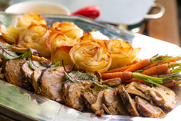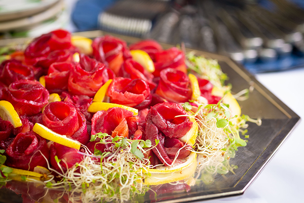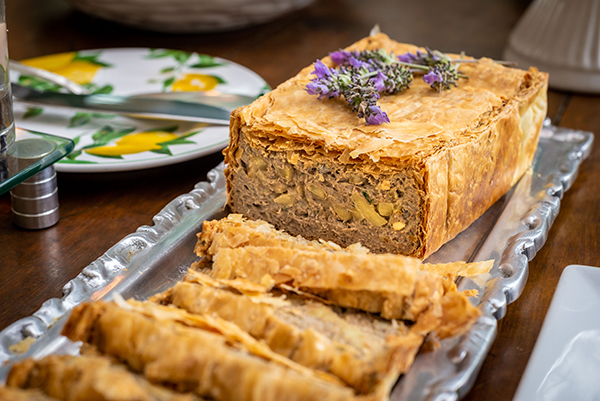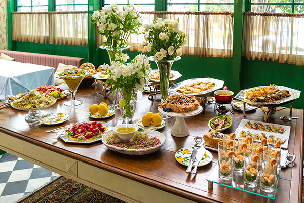 Entre as receitas elaboradas pelo chef Cadu Parolari, Terrine de pato em massa folhada; Salmão gravilax; Crepe de palmito; Timbale de bacalhau e grão de bico; Pernil de vitelo assado; além de saladas, queijos, defumados, pães e sanduíches, como croque monsieur – todas dispostas em uma mesa decorada.