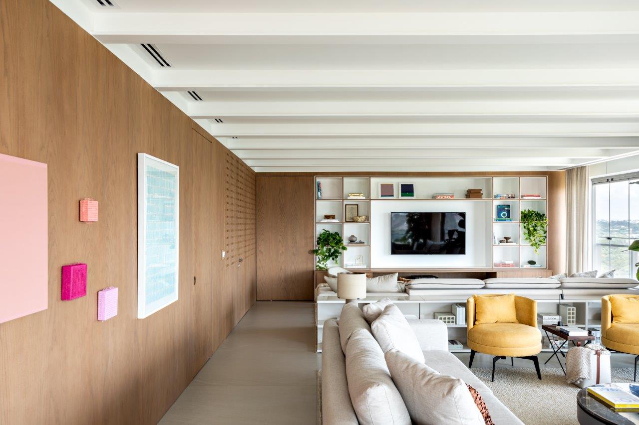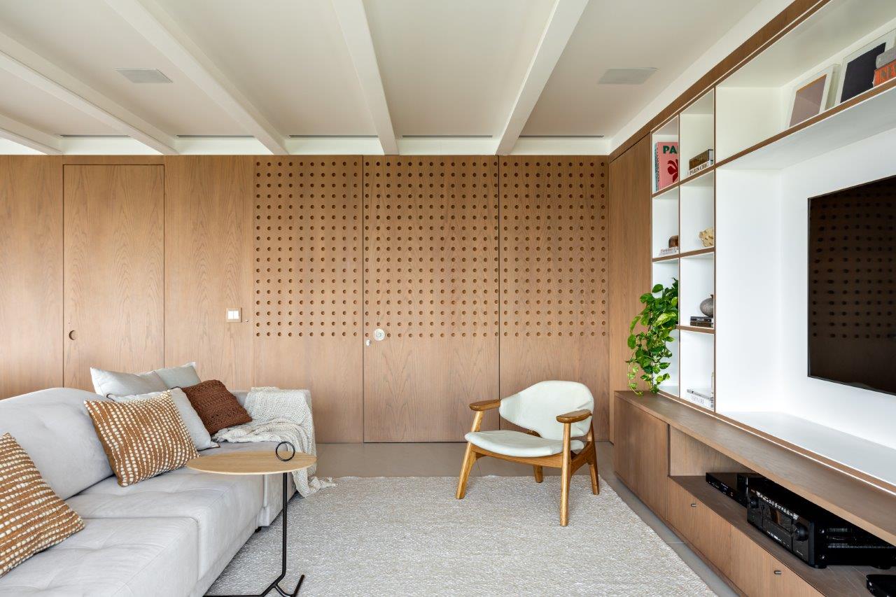 Já a sala, como foi toda integrada, foi tirado partido de um painel de madeira para integrar todas as portas e deixar um aspecto uniforme ao ambiente. A demarcação do hall e porta de entrada através de uma subtração de elementos circulares no painel e estante da TV em madeira e metálica, dão um ar mais jovem e leve para o todo e por fim o ritmo de vigas – sancas coroam o projeto.