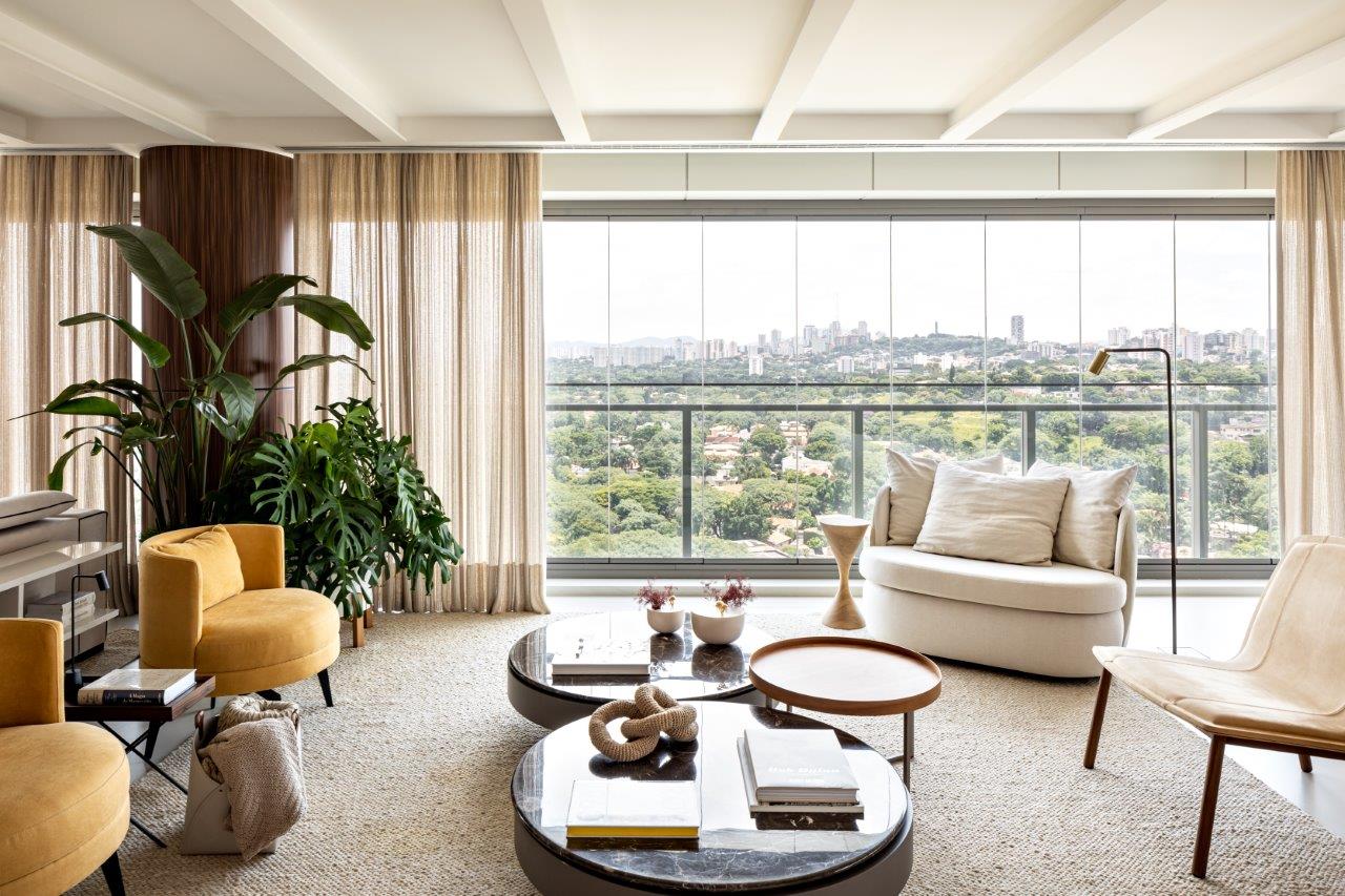 Os móveis, também foram cuidadosamente pensados, as arquitetas recuperaram alguns itens do antigo apartamento dos proprietários, como o sofá e o aparador adjacente, e optaram por poltronas giratórias para maior flexibilidade dos espaços. A escolha dos tecidos se deu através de bases neutras adicionando tramas e texturas, com pequenos pontos de cor, trazendo mais suavidade. O uso de elementos naturais como couros, pedras e madeiras propiciam um ambiente caloroso e acolhedor.