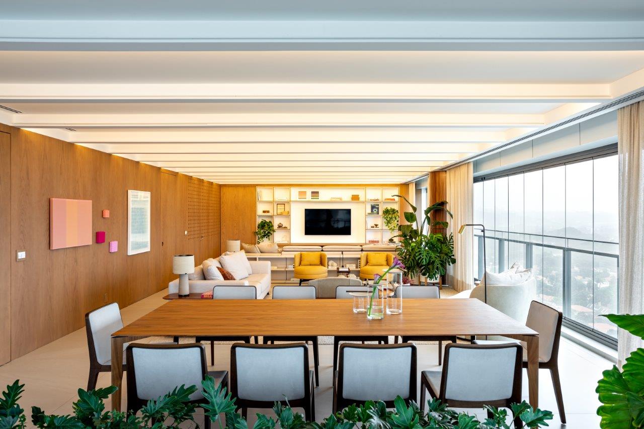 Do ponto de vista da planta, as principais mudanças foram as integrações das salas com as varandas, e alcançar um layout adequado numa cozinha toda recortada e cheia de ângulos. Ao mesmo tempo que as varandas foram unificadas, os proprietários pediram que o espaço do gourmet ficasse de certa forma apartado do restante dos ambientes, já que ainda tinha um desejo de espaço mais descontraído e com atmosfera de área externa. Então foi criado um banco – floreira como anteparo para a delimitação dos espaços.