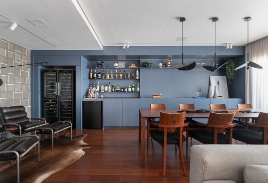 O design brasileiro é o protagonista deste apartamento, que foi pensado para valorizar a cultura e a arte nacional. Cada peça do mobiliário foi escolhida com cuidado, buscando harmonizar forma, função e estilo. Entre os destaques, estão as poltronas do bar e as cadeiras da varanda da Prototyp&, que trazem um toque de modernidade e ousadia, a mesa de jantar e o sofá da Cremme, que foram premiados pelo seu design inovador e elegante, as cadeiras de jantar e as poltronas da área externa são da Fahrer, que combina conforto e qualidade, o aparador, o banco do hall de entrada e o banco do quarto são obras do renomado designer brasileiro Fernando Jaeger, que imprime sua identidade em cada criação. A mesa da varanda é da Traço Objetos, que se destaca por usar materiais sustentáveis e criar móveis com design contemporâneo. O apartamento é um convite para apreciar o talento e a criatividade dos designers brasileiros, em um espaço sofisticado, confortável e com personalidade.