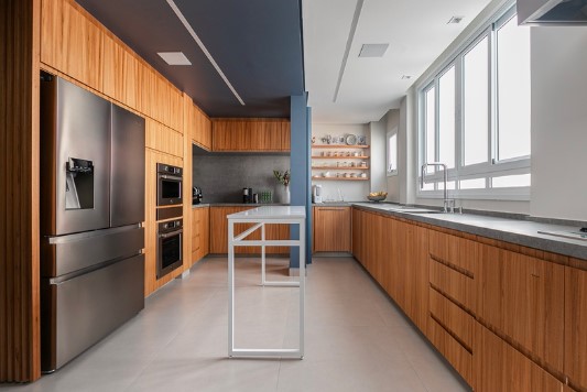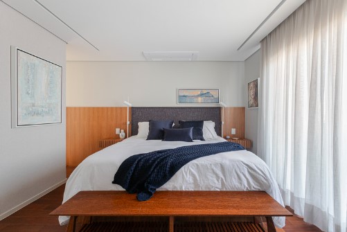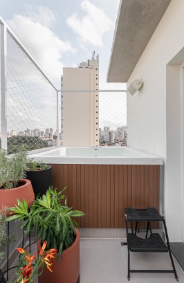 “O maior desafio enfrentado durante a realização deste projeto foi a completa reforma de um apartamento de 50 anos em um período recorde de seis meses. O projeto exigiu duas intervenções estruturais significativas: reforços metálicos para suportar o peso da banheira no banheiro principal e para o spa na varanda. Além disso, as chuvas representaram um desafio adicional, especialmente para a área externa da varanda, que precisava ser impermeabilizada”, revela Natália Salla.
