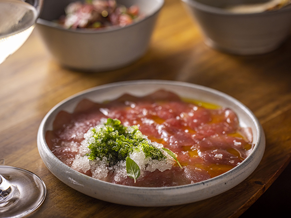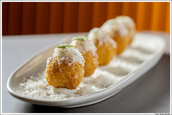 A gastronomia da nova casa é mediterrânea com supervisão kasher. São sugestões leves e frescas feitas com ingredientes sustentáveis vindos de pequenos produtores. Há opções sem glúten, sem lactose, vegetariana e vegana. A casa possui diversas opções de mezes: pequenos pratos servidos como aperitivos para compartilhar à mesa ou servido como principal e são o grande destaque do cardápio assinado pelo chef Pedro Renófio com passagens pelo Evvai e Tanit. Entre eles: Alcachofra confitada com purê de alcachofra, alho, sálvia, mini croutons e cebola (R$69); Arancini Cacio e Pepe (Crocante de arroz com queijo e pimenta preta-R$49, FOTO); Cenoura caramelizada com mel, iogurte, nozes e tomilho (R$69) e o Tartare de tomate, pickles, alcaparra, mostarda dijon, cebola roxa(R$54).