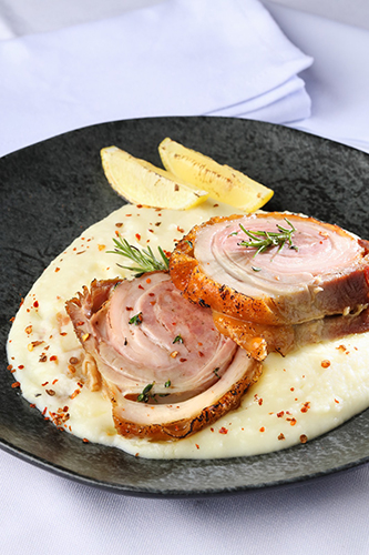 Além de buscar as receitas originais de clássicos italianos, o elegante restaurante da Vila Olímpia, que fica no andar superior da loja de vinhos Grand Cru, não fica apenas nas pastas – como sua famosa lasanha com doze horas de preparo – mas também encanta nas carnes, como a Porchetta: cortes de pancetta e lombo de porco temperados com ervas e cozidos por doze horas e acompanhado de purê de maça verde (foto).