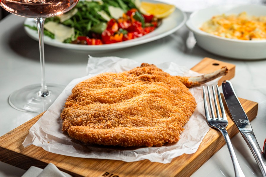 Comandada pelo trio de sócios Cid Simão, Marcos Freitas e Rodrigo Queiroz, que está à frente do premiado Tre Bicchieri, o restaurante Bicchieri, que serve uma cozinha italiana “informal” oferece a Cotoletta di Maiale Alla Milanese (R$ 98), carré suíno à milanesa com salada de rúcula, lascas de grana padano, tomatinhos cereja e manjericão ou couve-flor gratinada.