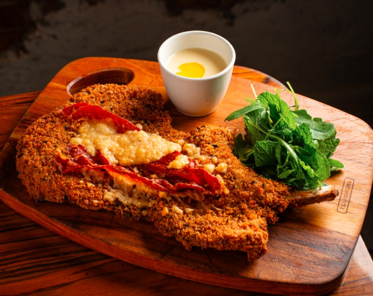 Focado nos sabores romanos, o Daje Roma, em Pinheiros, oferece em seu cardápio o Cotoletta Daje Roma (R$126) que é uma cotoletta de porco empanada, com fonduta de Pamegiano Reggiano Trufado, presunto parma e rúcula selvagem.