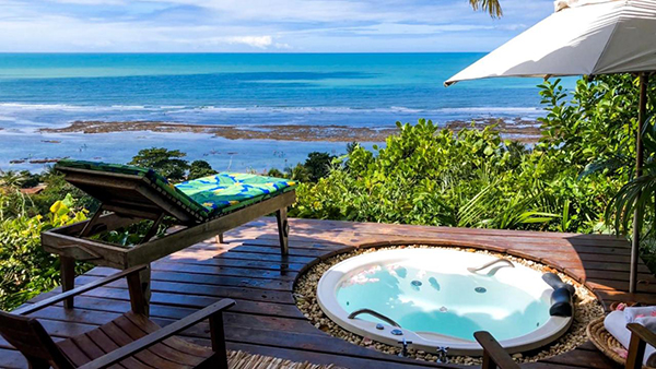 Esta acomodação localizada em Arraial D’Ajuda, na Bahia, oferece uma vista panorâmica do mar, com varandas privativas com redes e quartos com banheiras de hidromassagem. A apenas 6 minutos a pé da praia e próximo ao centro da cidade, com seus vários restaurantes e bares, o local é perfeito para relaxar apreciando a vista, admirar o nascer do sol na piscina e aproveitar o clima baiano.