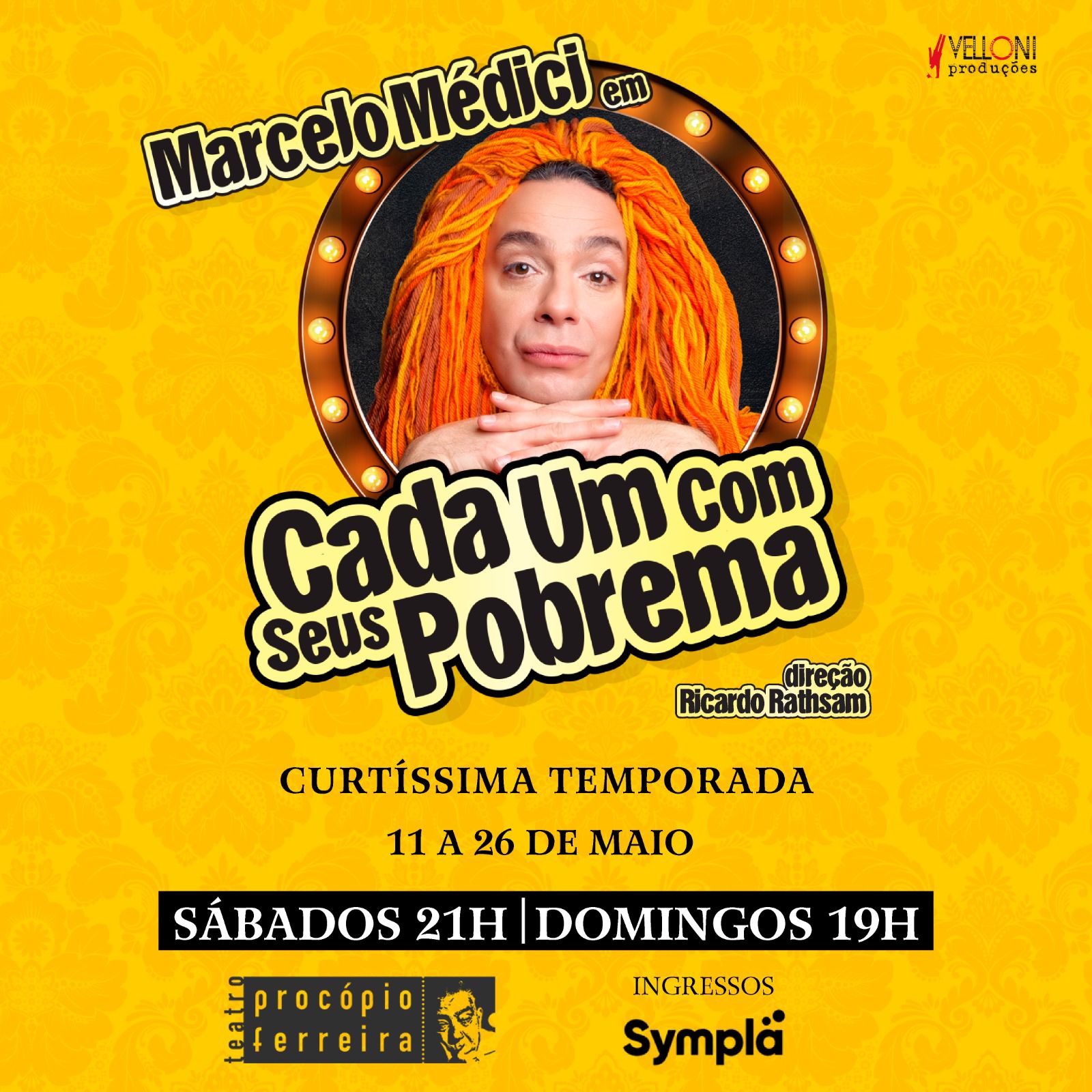 Escrito, com a colaboração de Rathsam, e interpretado por Marcelo Médici, o espetáculo já é considerado um clássico do ator. Durante sua trajetória, a peça conquistou prêmios e chegou a ter ingressos esgotados com três meses de antecedência. Com mais de 30 anos de carreira no teatro, e se dividindo em novelas, filmes e humorísticos, Marcelo Médici protagonizou vários outros espetáculos de sucesso, incluindo musicais da Broadway. Porém o que mais escuta do público é a pergunta: “quando você retornará com o Cada Um Com Seus Pobrema?”. Atendendo a pedidos, o ator remonta seu solo em poucas e especiais apresentações.