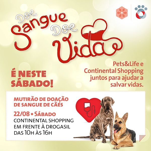 No próximo sábado, 22/08, acontece em São Paulo a Campanha de Doação de Sangue de Pet, no Continental Shopping em parceria com a Pets & Life, das 10h às 16h.