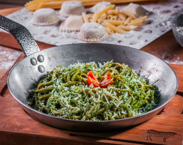 Há também opções de pratos vegetarianos como Espaguete ao Pesto (R$56) e Ravióli de Ricota (R$69), além de pescados e frutos do mar.