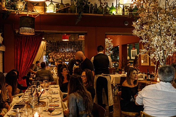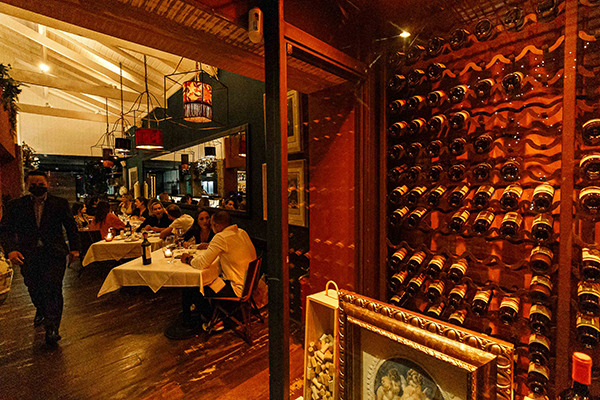 As indicações para almoço ou jantar começam em um dos itens instagramáveis e não menos saboroso para compartilhar, o o Antipasti L`Albero (R$ 89), que suspende em tira de nylon apoiada em estrutura de madeira, fatias de presunto, mortadela Italiana, salame soppressata e queijos como gorgonzola dolci e taleggio. Na base, potinhos de caponata siciliana , peperonata e manteiga aerada. Ou o Carpaccio de Polpo (polvo laminado, marinado com azeite e limão siciliano) por R$69. Dos pratos principais estão o Gnocchetti Tartufati (nhoque de batatas, fonduta de parmigiano, tartufo e amêndoas torradas) a R$77 e o Cavatelli Gratinati (massa curta, ragu de linguiça, fonduta de grana padano e mozzarella gratinada) de R$65. As opções de sobremesa incluem o Cannoli Siciliani Doc (casquinha crocante, creme de ricota, gotas de chocolate e pistache) a R$33 e a Panna Cotta All’Amarena Fabbri (flan de baunilha e cereja italiana em calda) por R$35. Além da coquetelaria, a adega impacta logo na entrada.