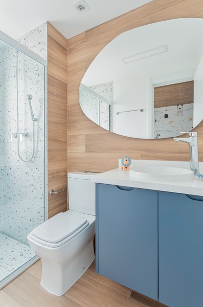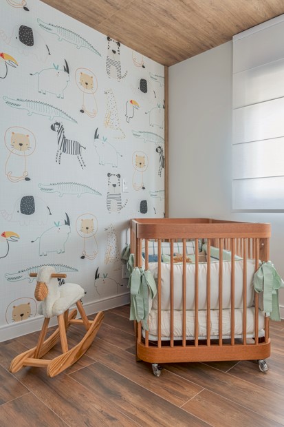 O quarto do bebê é o destaque do projeto. “Com o propósito de tornar o apartamento em um refúgio para o filho do casal, criei ambientes aconchegantes e amplos. Por isso, um dos destaques do apartamento é a suíte do pequeno, mostrando que a simplicidade transmite elegância através de mobiliários minimalistas e poucos elementos decorativos, o ambiente transmite tranquilidade e aconchego, proporcionando um espaço ideal para o descanso e o desenvolvimento da criança”.