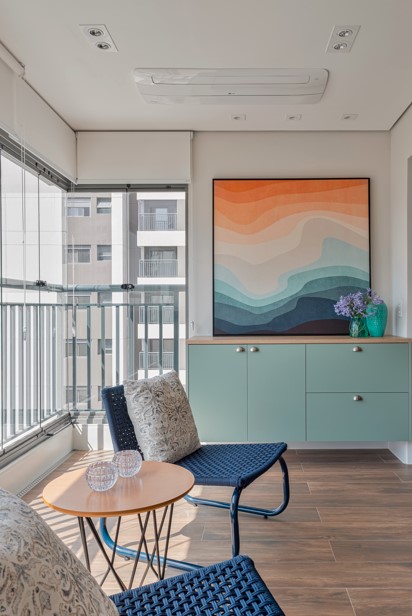 Um dos destaques do projeto é a marcenaria sob medida, que integra armários, estantes e painéis, otimizando o espaço e adicionando um toque de elegância ao ambiente. O uso de materiais como couro, madeira e porcelanato garante durabilidade e beleza, além de conferir um ar sofisticado à decoração.