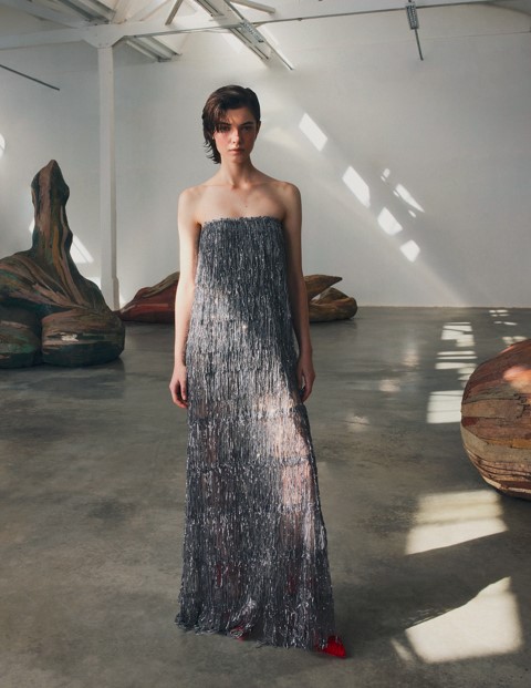 O vestido cinza de franjas numerado e statement acompanhado de um movimento que toma o protagonismo a partir da transparência sutil do tecido é um dos destaques da coleção Magicians of Life para a linha festas. Há, sobretudo, ênfase para o extremo cuidado com os aviamentos trabalhados como verdadeiras mini-obras de arte em madeira, resinas ou banhados a ouro.