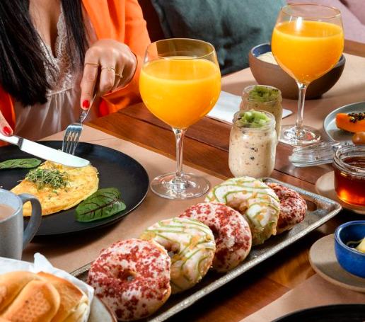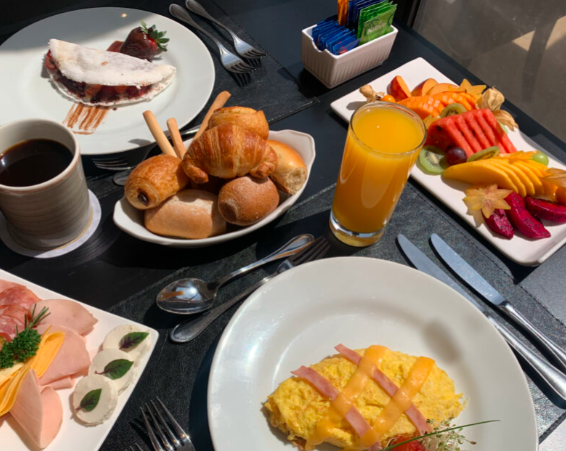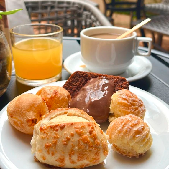 Buffet completo com variados tipos de frutas; ovos, bacon cereais, croissant francês, pain au chocola, bolos caseiros, opções saudáveis, tapioca preparada na hora, omelete preparado na hora por R$ 44,90.