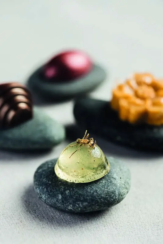 As sobremesas mantêm a referência a ingredientes brasileiros. Uma das etapas traz maria-mole de jabuticaba com mel de abelha nativa; a outra, sorvete de louro com bolhas de chocolate e cristais gelados de cupuaçu. O encerramento reúne pequenos doces, como goiaba com alga e chocolate rubi, brigadeiro de pequi com milho e a formiga amazônica de sabor cítrico, ingrediente recorrente na trajetória do chef.