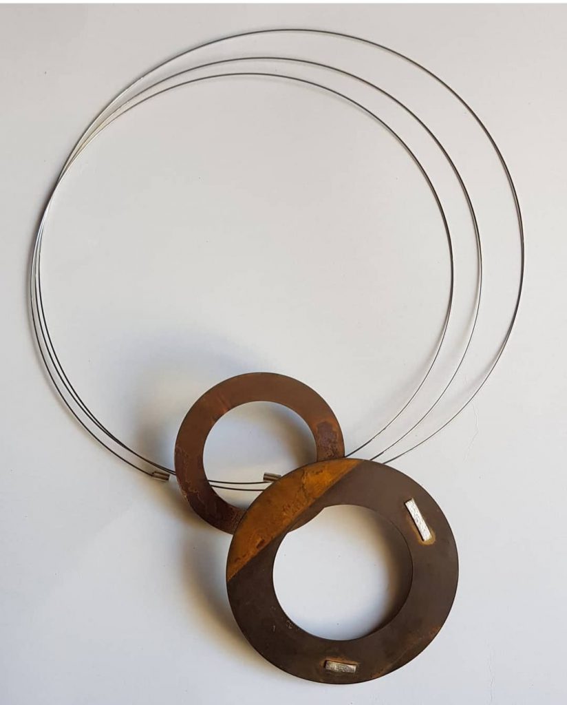 3 – Burghi Brasil (colar), designer Regina Burghi – Natural do Mato Grosso do Sul – Regina cria desde 2010 uma joalheira autoral como uma estilista de acessórios contemporâneos. “Cada trabalho a experiência como escultora”. Explora novos materiais, conexões e encaixes até atingir equilíbrio e tridimensionalidade: ouro (reuso), prata, cobre, gemas, madeiras, ferro, alumínio.