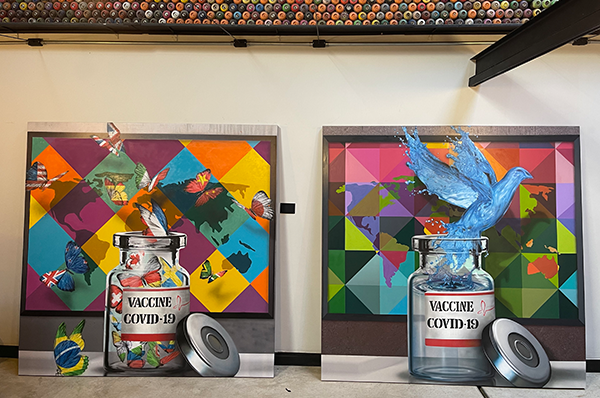 O artista entrega amanhã, terça-feira, dia 23 de fevereiro, as duas telas feitas no início do ano passado, inspiradas na esperança no êxito do desenvolvimento de vacinas para a imunização das pessoas na luta contra a Pandemia.