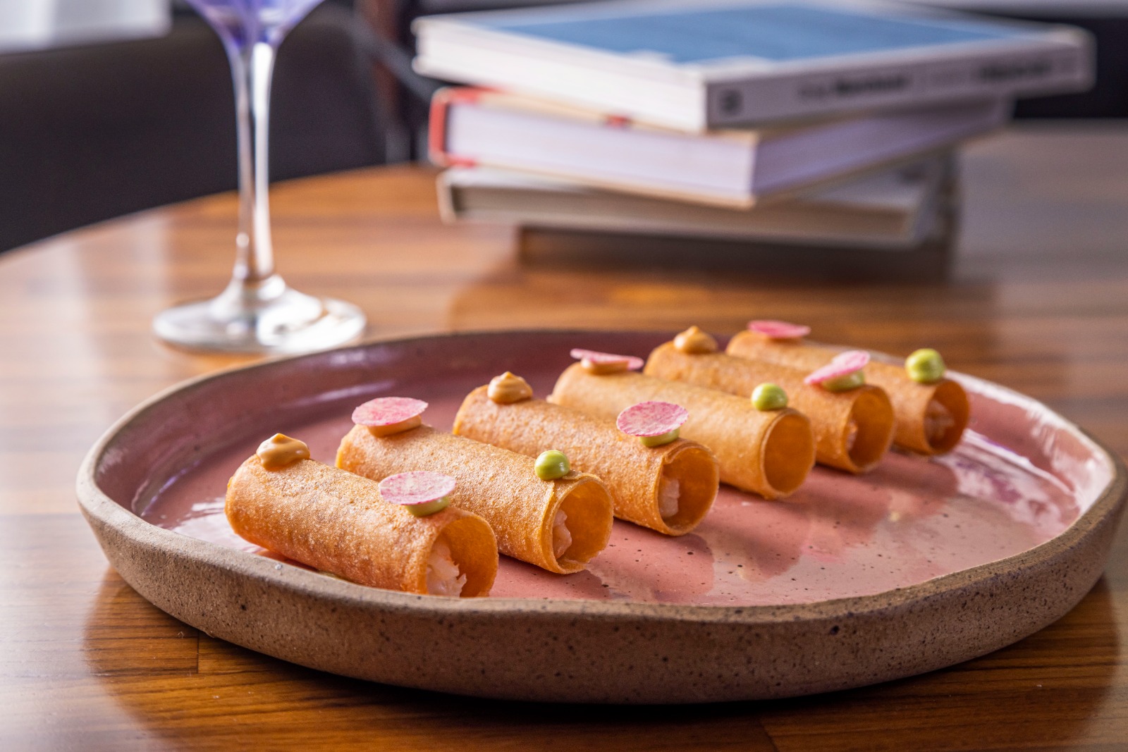 A experiência começa com pastel de queijo Comté e compota de cebola, seguido do principal, carré de porco servido com tutu de feijão, crispy de couve, ovo mollet, banana frita e arroz da Mantiqueira. Para encerrar, a sobremesa Colunas do Edifício Esther — crocantes recheadas com banoffi especial, seladas com pingos de doce de leite aveludado — presta homenagem à arquitetura icônica que abriga o restaurante, em uma criação que une estética, memória e doçura equilibrada.