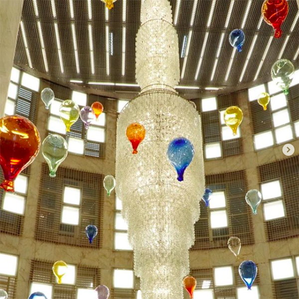 A instalação no espaço de entrada do Farol, intitulada Revoada, consiste em uma cenografia lúdica e imersiva, com aproximadamente 70 balões de vidro, medindo de 90cm a 40cm, coloridos e suspensos a partir do teto. A suspensão dos balões foi realizada com cabos de aço que dão a sensação dos objetos estarem voando pelo ar.