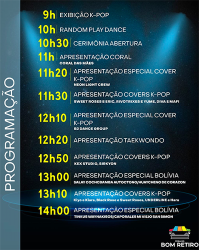 Das 9h às 17h o público poderá circular pelas barracas que irão oferecer pratos das culinárias coreana, judaica, latino-americana, italiana e portuguesa, artesanato e produtos típicos desses países e se divertir com apresentações de Covers de K-Pop, shows musicais e danças folclóricas, entre outras atrações.