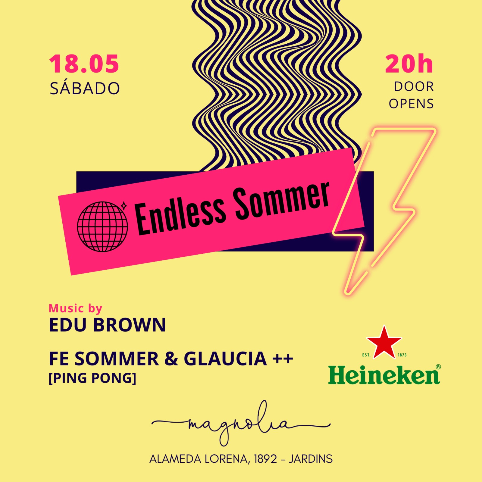 Fernando embarca num novo projeto, a Endless Sommer, que estreia neste sábado, dia 18 de maio, garantindo muita house music com Edu Brown e Glaucia ++ nos decks o projeto em parceria com a Heineken promete entregar uma noite recheada de experiências e surpresas lúdicas. E para que essa mágica aconteça Sommer escolheu como residência um espaço novo e muito especial, localizado na Alameda Lorena, 1892, no coração do Jardins. Lá você encontra o Magnolia, espaço novo que traz para a cartela de opções de diversão um conceito inovador, o de Pocket Club, formato que integra um espaço múltiplo com alta coquetelaria, ambiente intimista e confortável distribuídos em áreas com diferentes formatos: bar tradicional, pista de dança com palco, lounge e área aberta.