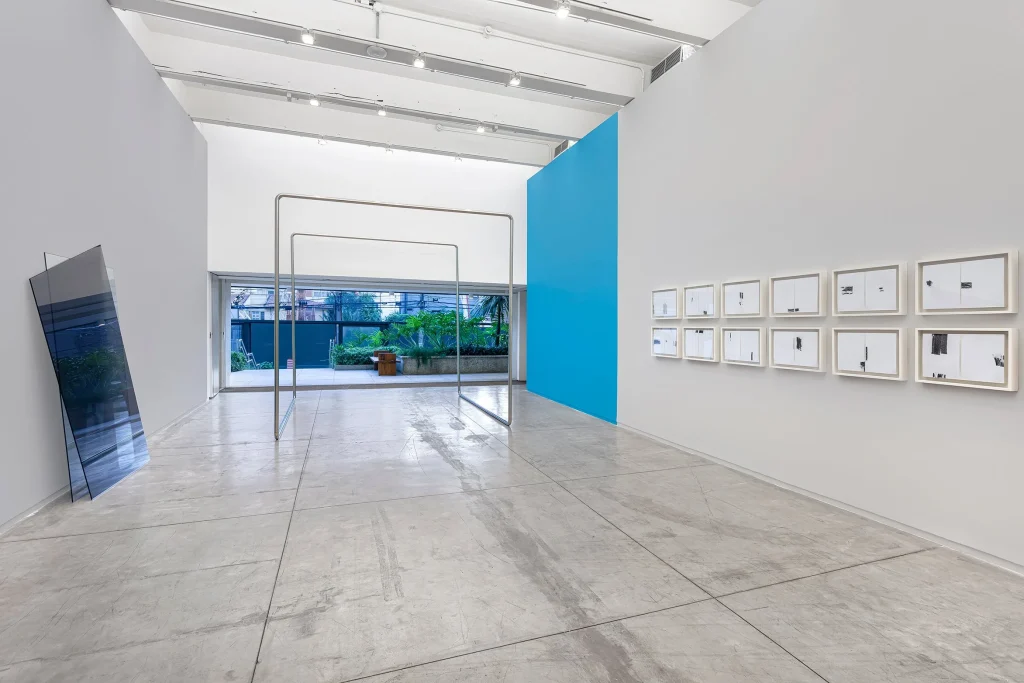 Nas paredes laterais, a mostra apresenta um conjunto de desenhos em carvão e pastel seco que exploram transições entre a segunda e a terceira dimensão, com variações cromáticas em azul, vermelho, amarelo e preto. Em outra área da galeria, esculturas em vidro, aço corten e tecido investigam relações entre planos, reflexos e transparências, criando efeitos visuais que ampliam a percepção do espaço e do movimento do público.