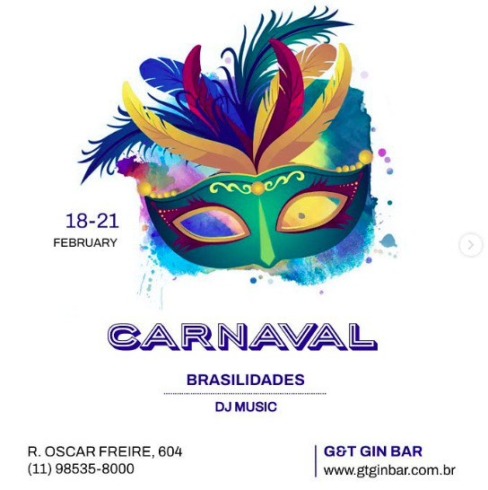 Para festejar o carnaval paulistano, de sábado (18/02) a terça (21/02), o G&T Gin Bar traz uma carta de drinks especiais e DJ com brasilidades.