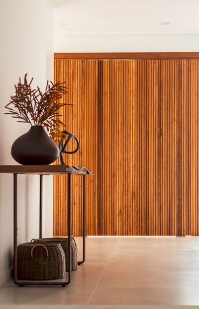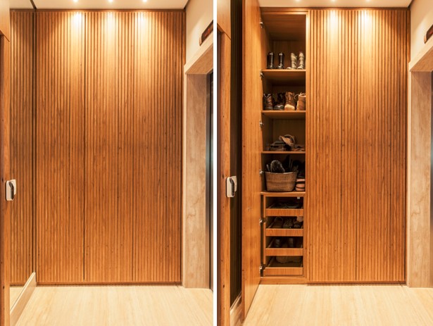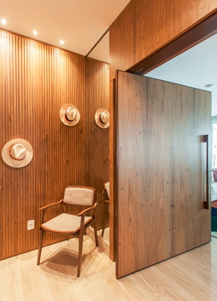 Ieda e Carina ressaltam que um ambiente perfumado é sempre mais acolhedor. Com efeito ripado, o armário nesse hall de entrada acomoda os calçados que são deixados antes de entrar no apartamento | Projeto do escritório Korman Arquitetos | Foto: Eduardo Pozella