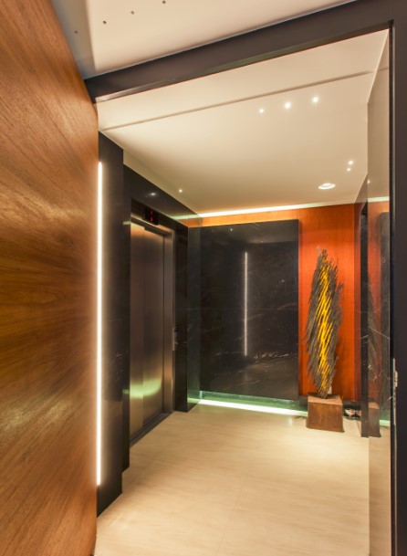 Nesse projeto, o LED no teto e na marcenaria entrega um clima intimista e aconchegante no hall de entrada | Projeto do escritório Korman Arquitetos | Foto: Eduardo Pozella