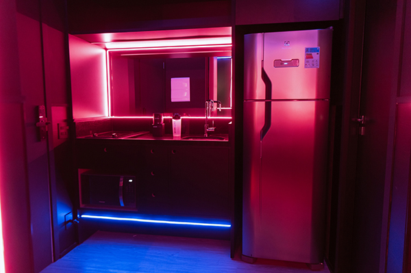Além de uma geladeira com o Overclock, energético em pó que os gamers usam para não ter sono e jogar por horas, o apartamento é escuro com fitas em LED para proporcionar uma iluminação adequada. O morador terá a sua disposição um PlayStation com os jogos mais recentes e também os tradicionais. E a cadeira gamer vai possibilitar que a diversão não tenha fim por falta de conforto.