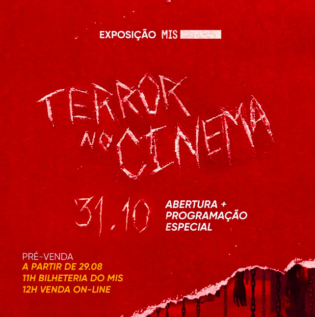 A pré-venda para os primeiros dias da exposição “Terror no cinema”, que chega ao MIS (instituição da Secretaria da Cultura, Economia e Indústria Criativas do Governo do Estado de São Paulo), no dia 31 de outubro, já está aberta. Os ingressos disponíveis são para os primeiros dias de visitação (31 de outubro a 04 de novembro), e podem ser adquiridos tanto na bilheteria física do MIS como pela plataforma INTI — link de vendas no perfil do Museu.