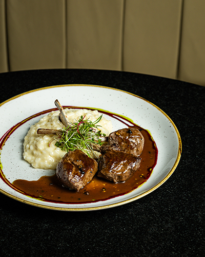 O Restaurante e Lounge, situado no andar térreo, tem capacidade para 140 pessoas além de uma varanda para a rua com mesas, cadeiras e sofás. No menu sugestões contemporâneas como Carré de cordeiro grelhado com risoto de parmesão e molho poivre vert (foto), Filet Iron grelhado servido com arroz sete grãos, farofa crocante e cebola marinada ou o Risotto de camarão com tomates cereja assados. Na carta de bebidas clássicos coquetéis como o Penicilin ou autorais como o Tupa, finalizado com defumação e o Cynara (Gold Label, Xarope de Amarena, Hortelã, Limão e Aquafaba. Finalização com uma cereja amarena no palito e borrifado com água de rosas).