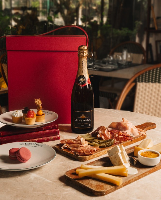 O Les Deux Magots, que acaba de celebrar dois anos de operação no Brasil, lança uma cesta especial de fim de ano com itens emblemáticos de seu cardápio. As encomendas podem ser feitas até 31/12. A seleção inclui espumante Veuve Ambal ou vinho Poême, pão de fermentação natural, baguete, manteiga, além de uma tábua de frios (copa lombo, salame, presunto, mortadela e chorizo com páprica) e outra de queijos (Comté, Saint-Paulin e Camembert). Complementam o conjunto mel trufado, creme de manga e mini tarteletes de morango, limão siciliano, chocolate 70% e mirtilo. O valor é R$ 499,99. A cesta pode ser encomendada pelo telefone (11) 94577-7854, com entrega em domicílio.