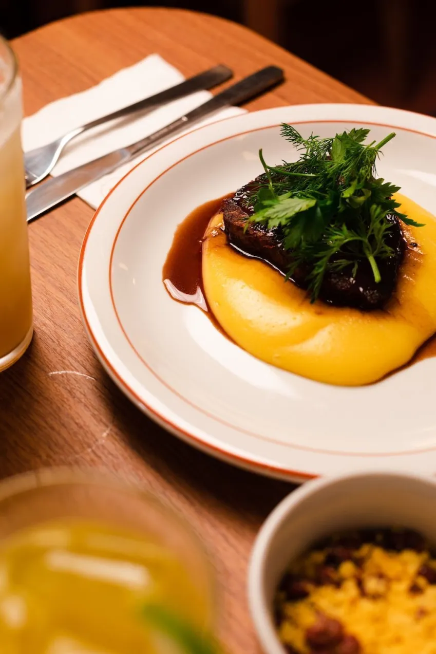 Nos principais, o cardápio traz pratos como o Cupim cozido por 12 horas, servido com purê de mandioquinha, molho de jabuticaba e farofa de feijão frito (R$ 86); a Costelinha laqueada com canjiquinha com fundinho de panela e kale com ponzu (R$ 83); e a opção vegetariana de Cogumelo tostado com angu com queijo tulha, milho e molho tzatziki (R$ 64). As sobremesas mantêm o tom autoral, como a Leninha (R$ 36), com doces de mamão verde e jabuticaba, queijo canastra, doce de leite e creme de ricota. Para finalizar, o café mineiro coado na hora vem acompanhado de cajuzinho (R$ 10).