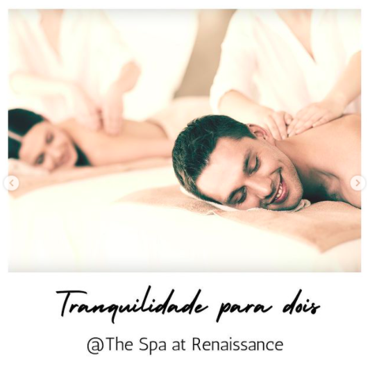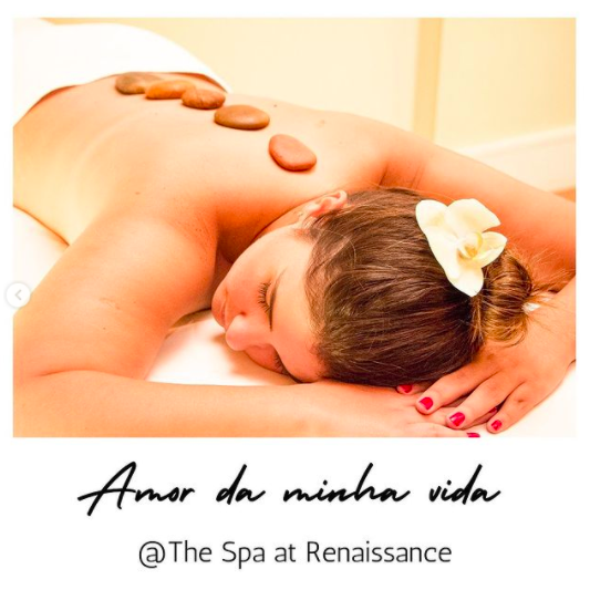Já os casais que preferem um momento relax ou um refúgio em meio à correria do dia a dia, o The Spa at Renaissance disponibilizou três vouchers presenteáveis: “Amor da Minha Vida”, com ritual de chegada; massagem com pedras quentes, terapia que oferece momentos relaxantes e benéficos para a saúde; tratamento facial Miracle Face, que promove um novo contorno do rosto; e ritual de despedida com taça de espumante. O tratamento tem 2h30 de duração (R$595).