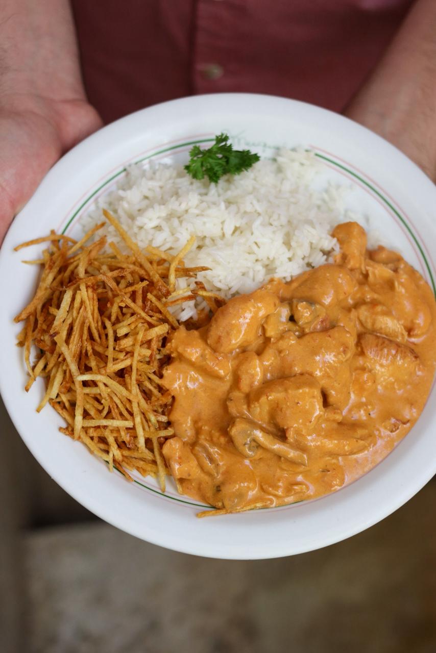 No Muquifo, o clima é acolhedor e inspirado nas receitas de família da chef Renata Vanzetto, que assina um cardápio afetivo e saboroso. Entre as opções, o Strogonoff clássico se destaca, preparado com molho cremoso e cogumelos frescos, acompanhado de arroz e batata palha homemade. O prato pode ser servido com tirinhas de filé mignon (R$ 88) ou em versão vegetariana com couve-flor (R$ 75).