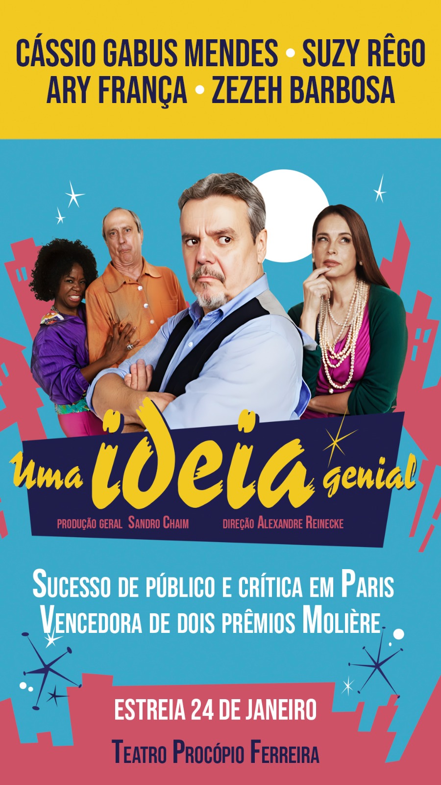 Os atores Cássio Gabus Mendes, Zezeh Barbosa, Ary França e Suzy Rego estreiam no dia 24 de janeiro, no Teatro Procópio Ferreira, a comédia “Uma Ideia Genial”. Vencedora de dois prêmios Molière e fenômeno de público em Paris, o espetáculo escrito por Sébastien Castro, marca a volta do ator Cássio Gabus Mendes ao teatro depois de 30 anos.