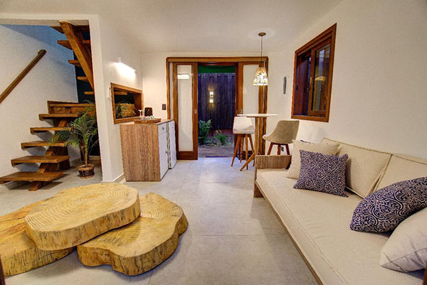 Onde ficar: a Malie Chalés oferece chalés espaçosos em decoração rústica, com varanda e vista para o terraço ao ar livre.