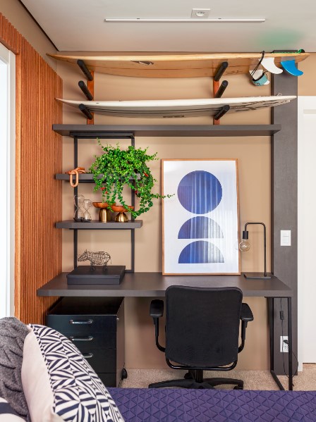 Uma das decisões mais ousadas do projeto foi a inversão dos ambientes. O que antes era o escritório, tornou-se o quarto de Diego, e vice-versa. Essa mudança permitiu otimizar o espaço e criar ambientes mais funcionais e personalizados.