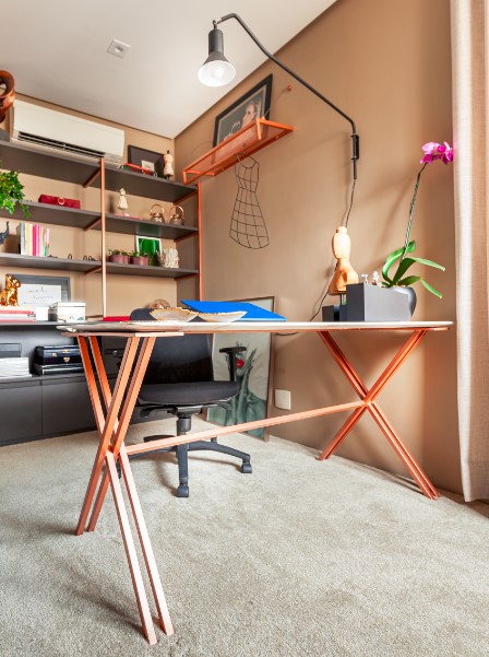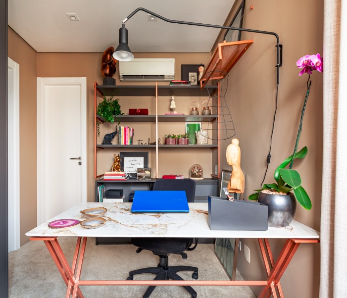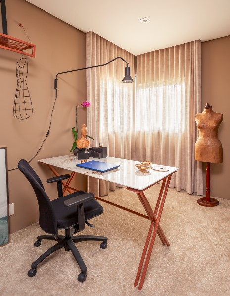 O home office de Juliana, antes um ambiente comum, foi transformado em um verdadeiro estúdio para gravações e reuniões online. A arquiteta optou por uma paleta de cores sofisticada, com detalhes em bronze, cinza e marrom, que transmitem elegância e profissionalismo. A mesa de trabalho, desenhada sob medida, combina metalon bronze e mármore, enquanto a estante, com acabamento em bronze, serve como cenário para os vídeos.